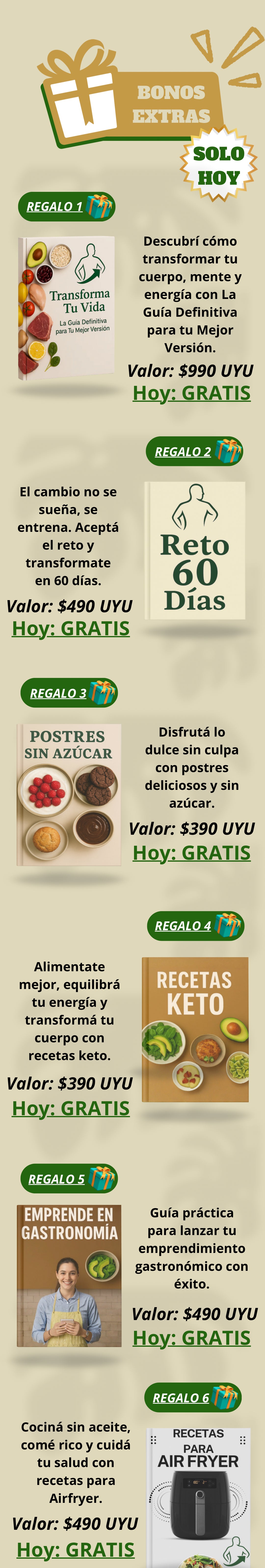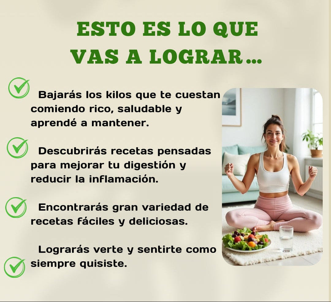 Porque con este ebook te ahorras tiempo y energía. No tendrás que pasar horas buscando recetas dispersas, incompletas o poco confiables en internet. Aquí encontrarás todo organizado de manera clara y práctica, con recetas saludables ya probadas.